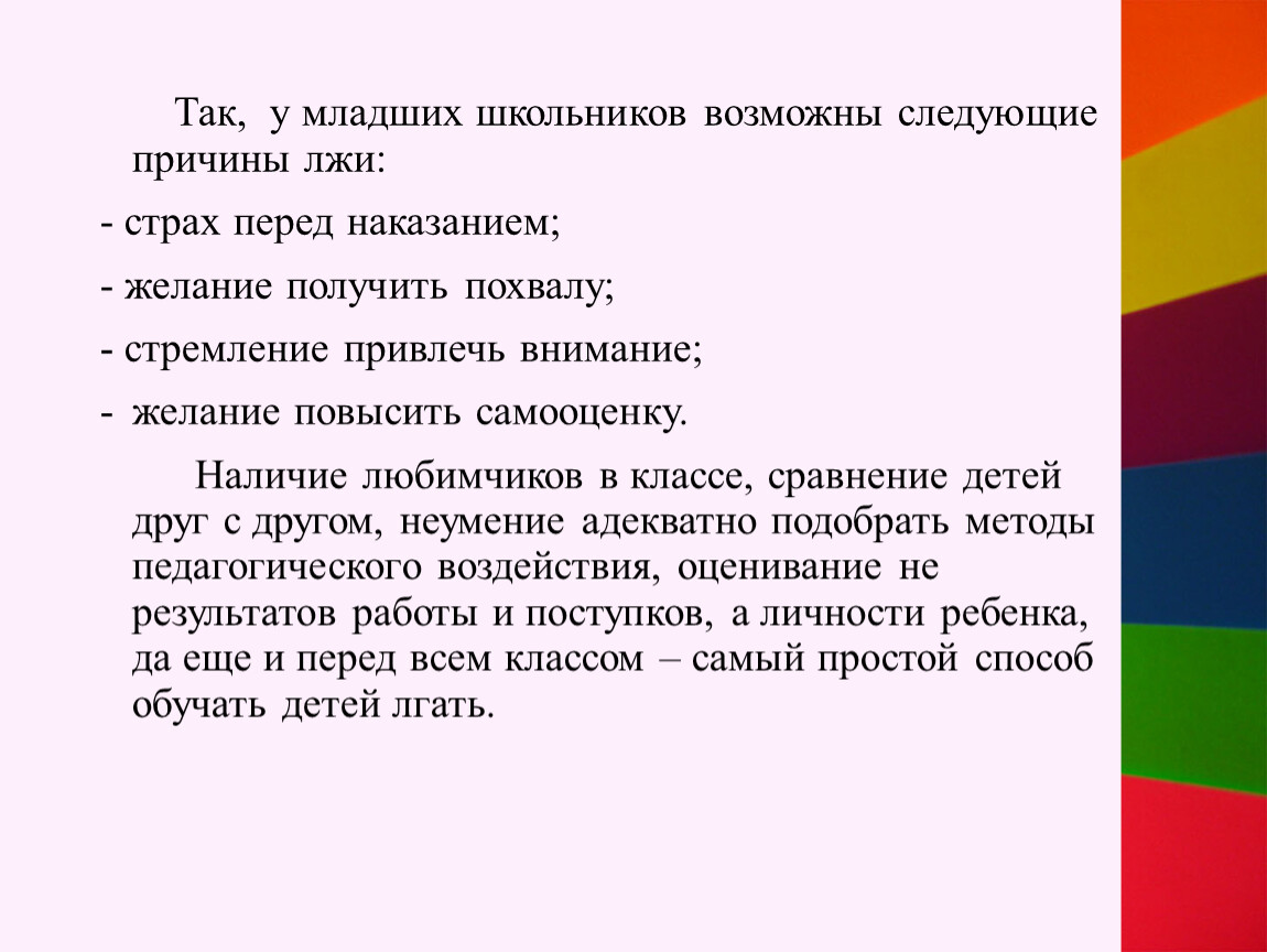 Наличие любимчиков в классе, сравнение детей друг с другом, неумение адекватно подобрать методы педагогического воздействия, оценивание не результатов работы и поступков, а личности ребенка, да еще и перед всем классом – самый простой способ обучать детей лгать.