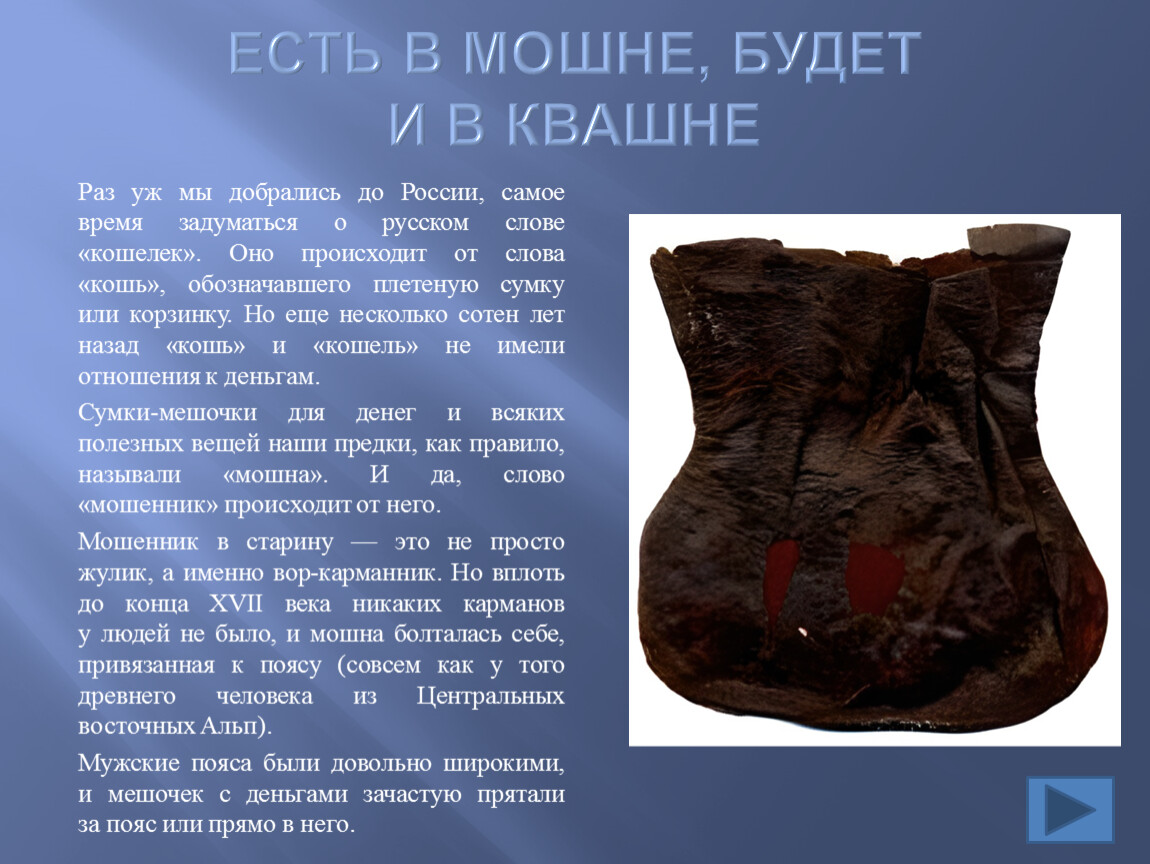 Сумки-мешочки для денег и всяких полезных вещей наши предки, как правило, называли «мошна». И да, слово «мошенник» происходит от него.