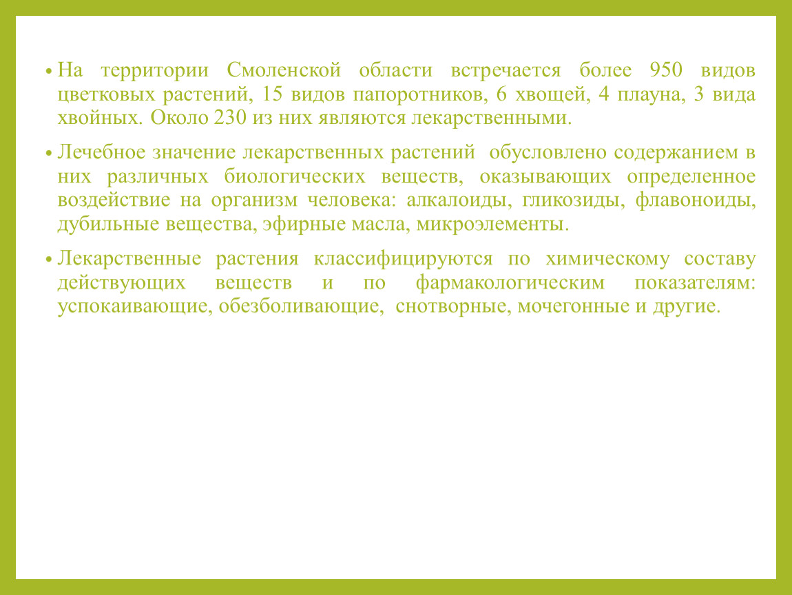 На территории Смоленской области встречается более 950 видов цветковых растений, 15 видов папоротников, 6 хвощей, 4 плауна, 3 вида хвойных. Около 230 из них являются лекарственными.