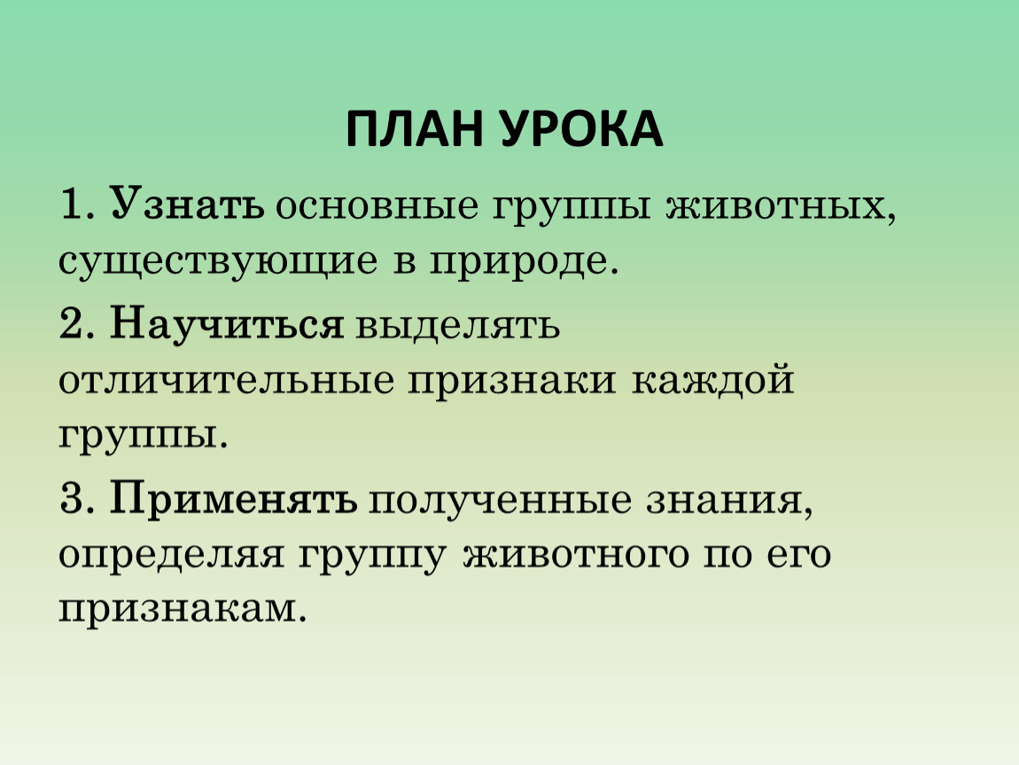 1. Узнать основные группы животных, существующие в природе.