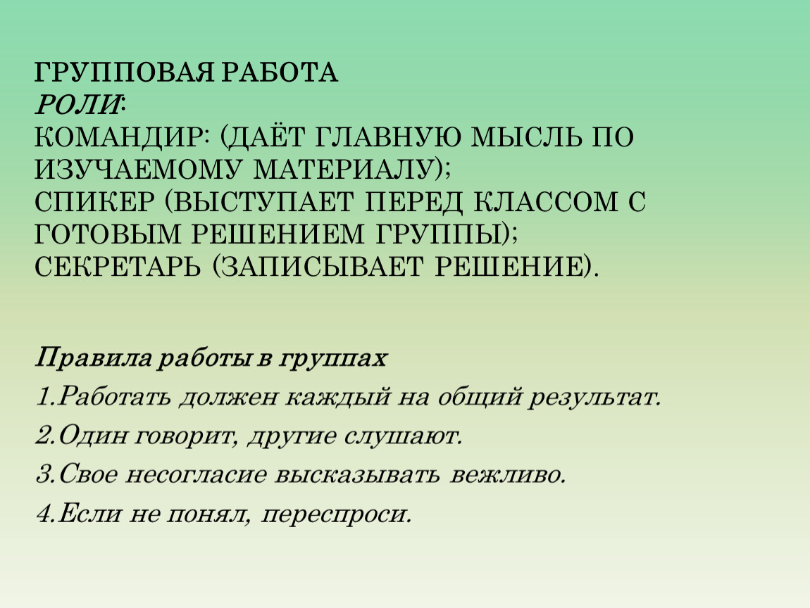 Групповая работароли:Командир: (даёт главную мысль по изучаемому материалу);Спикер (выступает перед классом с готовым решением группы);Секретарь (записывает решение).