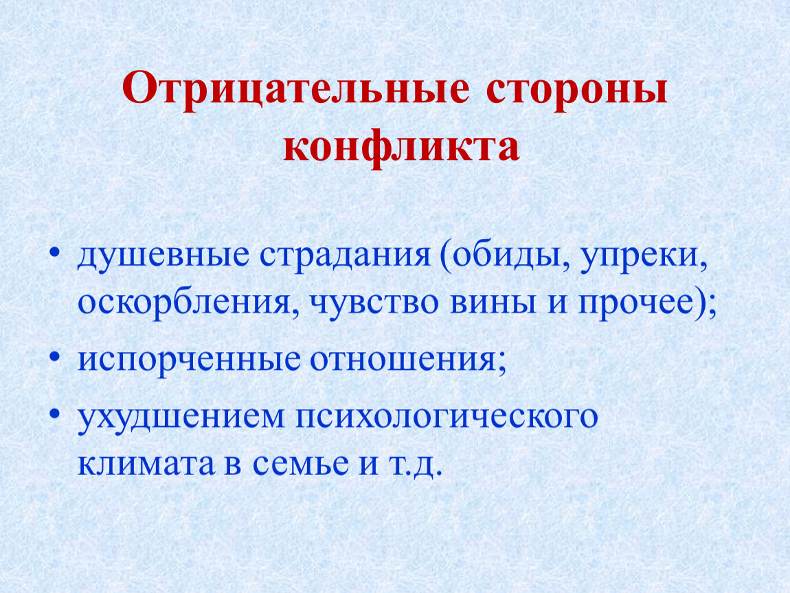 душевные страдания (обиды, упреки, оскорбления, чувство вины и прочее);