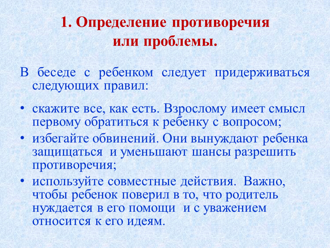 избегайте обвинений. Они вынуждают ребенка защищаться и уменьшают шансы разрешить противоречия;