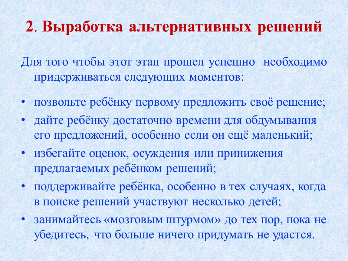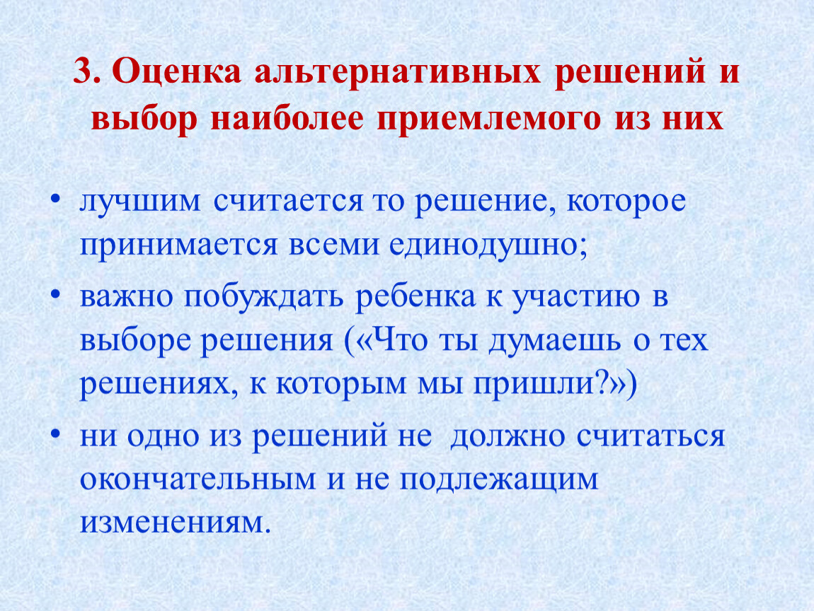 важно побуждать ребенка к участию в выборе решения («Что ты думаешь о тех решениях, к которым мы пришли?»)