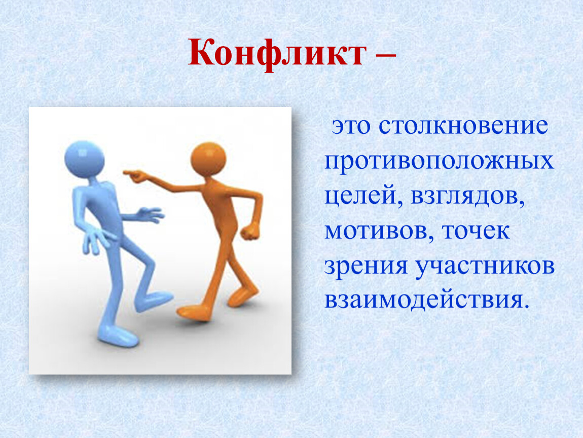 это столкновение противоположных целей, взглядов, мотивов, точек зрения участников взаимодействия.