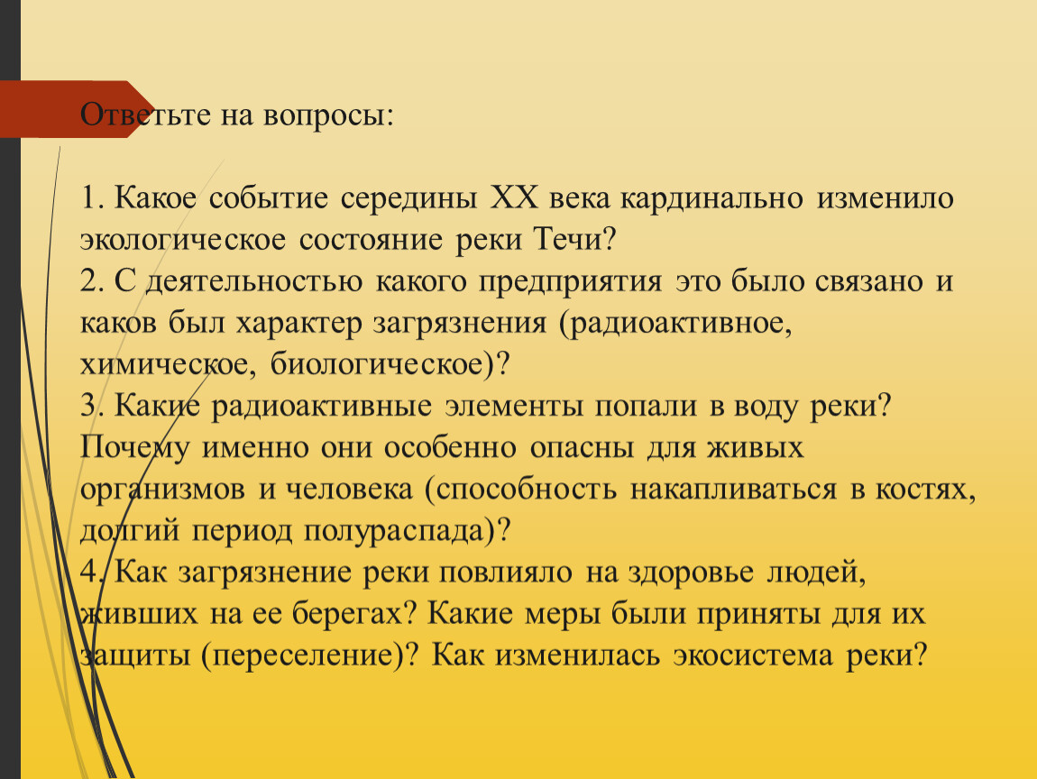 1. Какое событие середины XX века кардинально изменило экологическое состояние реки Течи?