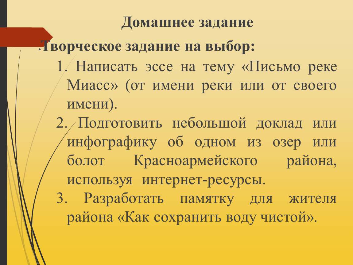 1. Написать эссе на тему «Письмо реке Миасс» (от имени реки или от своего имени).