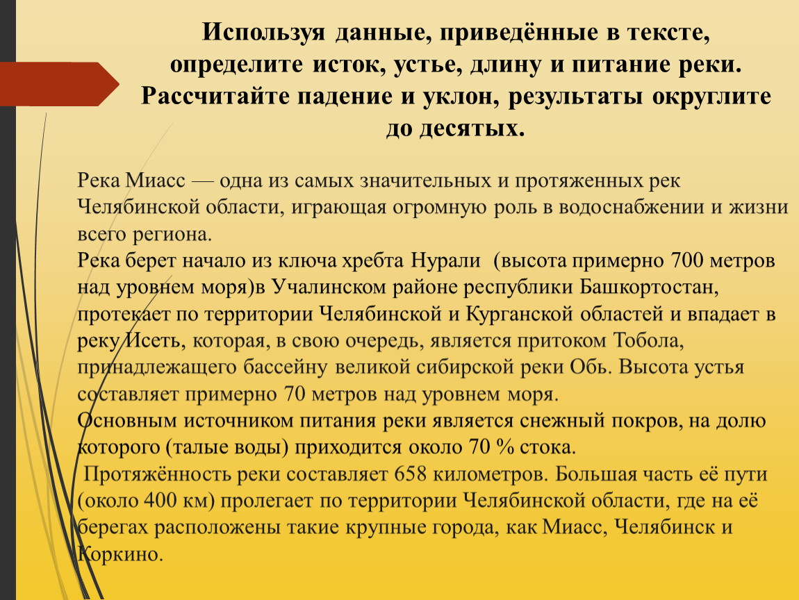 Используя данные, приведённые в тексте, определите исток, устье, длину и питание реки.