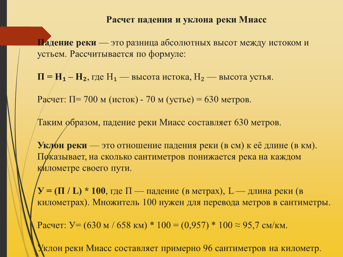 Расчет падения и уклона реки Миасс