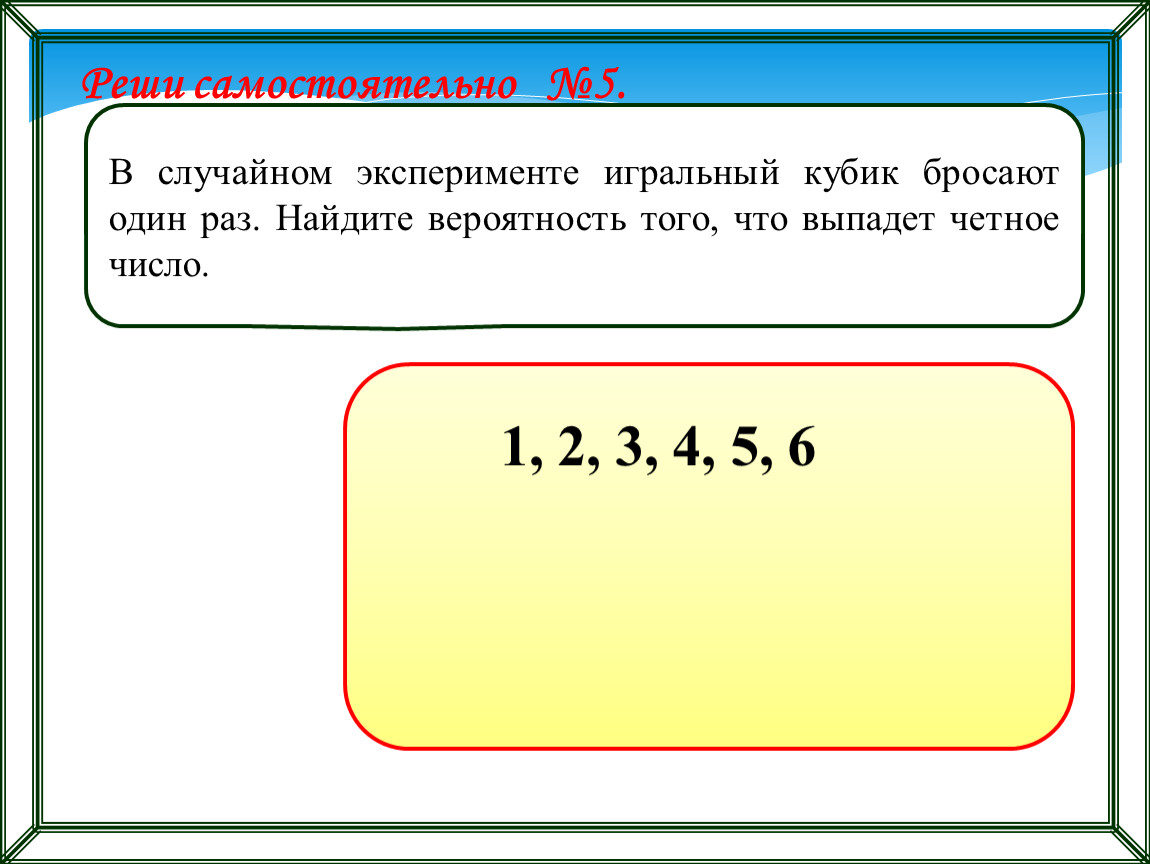 Задача 2. Игральный кубик бросили один раз. Какова вероятность того, что выпало число очков, большее чем 4.