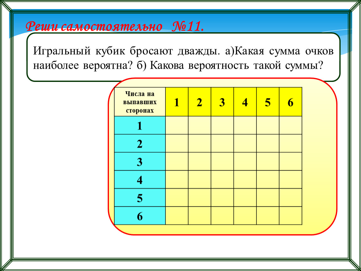 Игральный кубик бросают дважды. а)Какая сумма очков наиболее вероятна? б) Какова вероятность такой суммы?