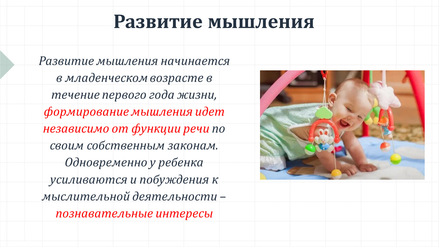 Развитие мышления начинается в младенческом возрасте в течение первого года жизни, формирование мышления идет независимо от функции речи по своим собственным законам. Одновременно у ребенка усиливаются и побуждения к мыслительной деятельности – познавательные интересы