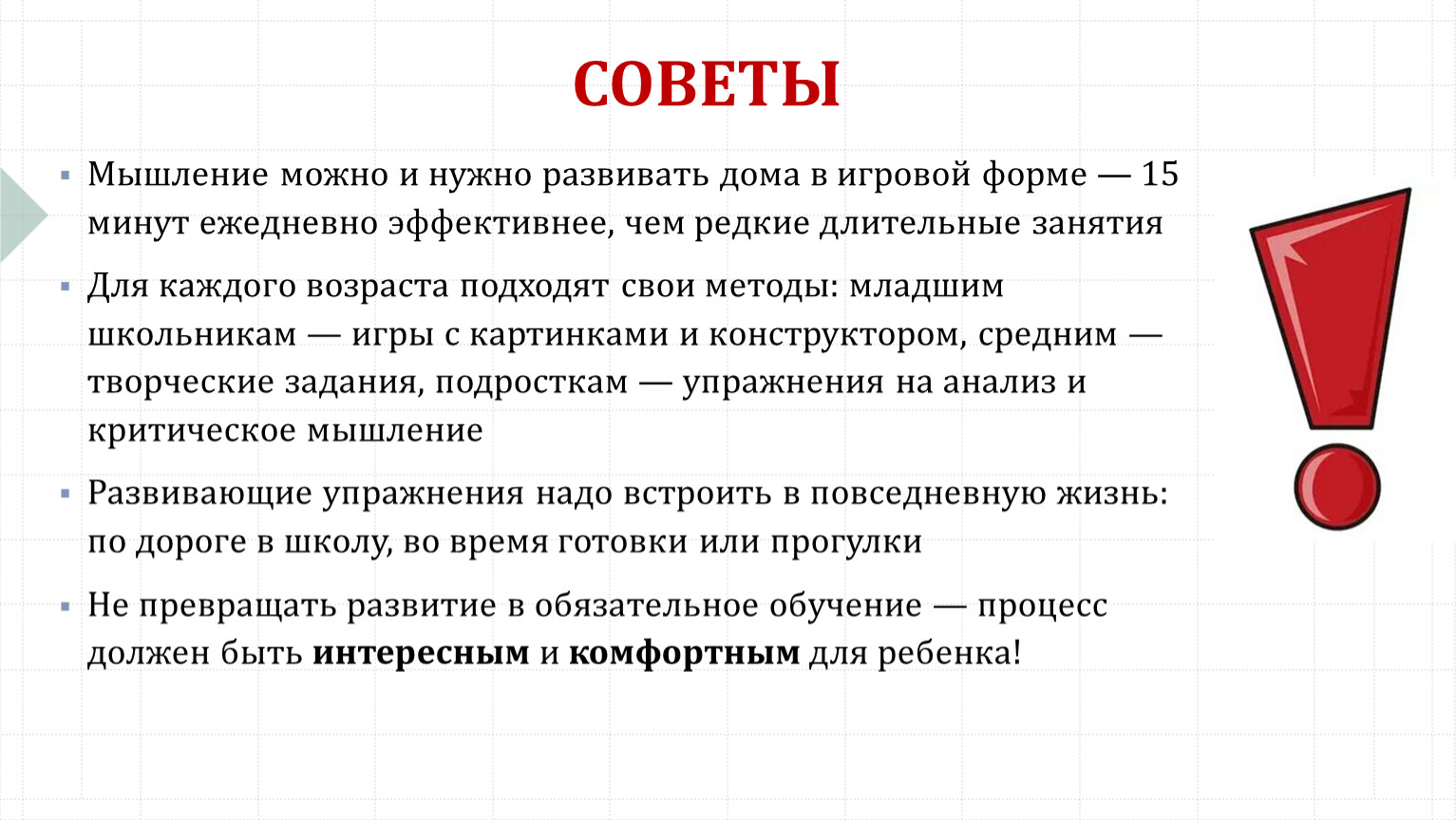 Не превращать развитие в обязательное обучение — процесс должен быть интересным и комфортным для ребенка!