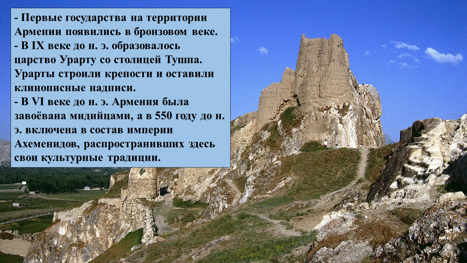 - В IX веке до н. э. образовалось царство Урарту со столицей Тушпа. Урарты строили крепости и оставили клинописные надписи.