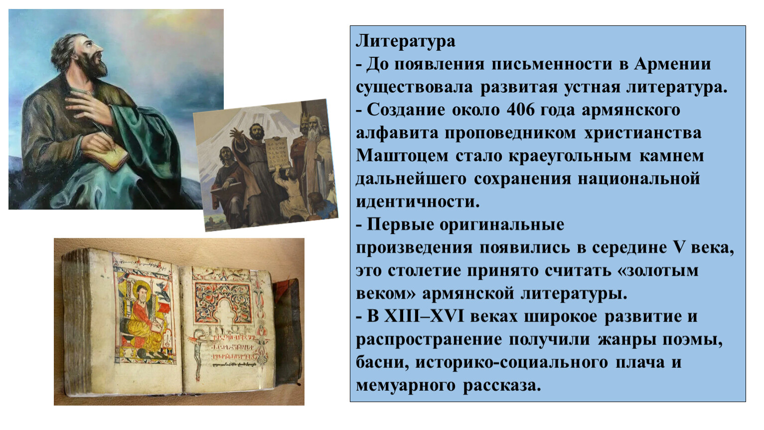 - Первые оригинальные произведения появились в середине V века, это столетие принято считать «золотым веком» армянской литературы.