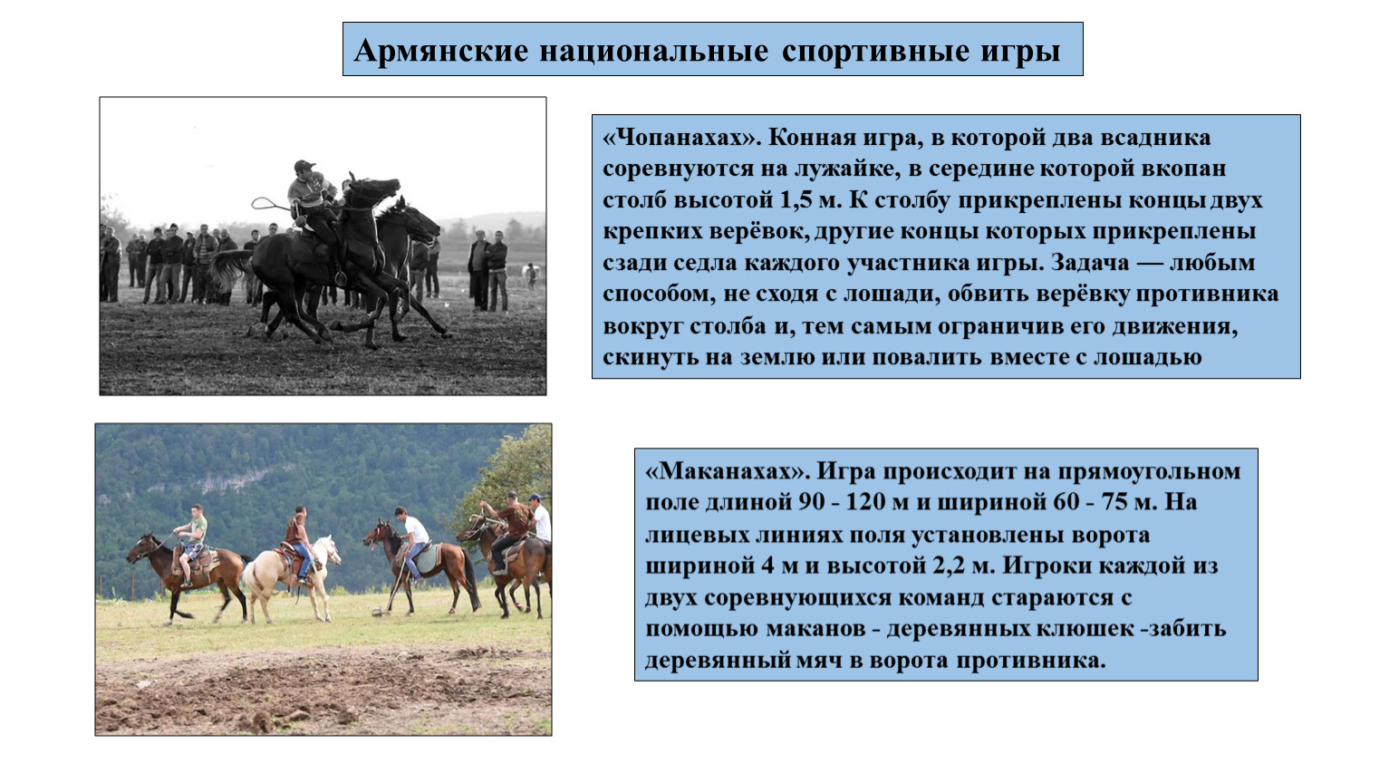 «Чопанахах». Конная игра, в которой два всадника соревнуются на лужайке, в середине которой вкопан столб высотой 1,5 м. К столбу прикреплены концы двух крепких верёвок, другие концы которых прикреплены сзади седла каждого участника игры. Задача — любым способом, не сходя с лошади, обвить верёвку противника вокруг столба и, тем самым ограничив его движения, скинуть на землю или повалить вместе с лошадью