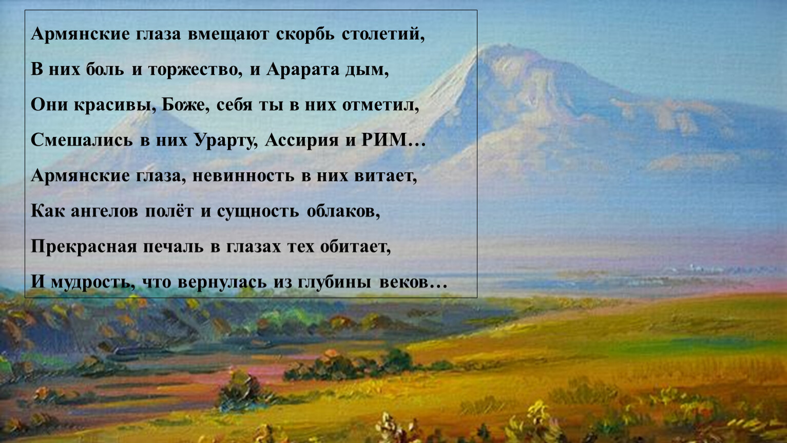 Армянские глаза вмещают скорбь столетий,В них боль и торжество, и Арарата дым,Они красивы, Боже, себя ты в них отметил,Смешались в них Урарту, Ассирия и РИМ…Армянские глаза, невинность в них витает,Как ангелов полёт и сущность облаков,Прекрасная печаль в глазах тех обитает,И мудрость, что вернулась из глубины веков…