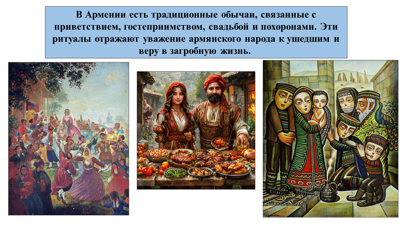 В Армении есть традиционные обычаи, связанные с приветствием, гостеприимством, свадьбой и похоронами. Эти ритуалы отражают уважение армянского народа к ушедшим и веру в загробную жизнь.
