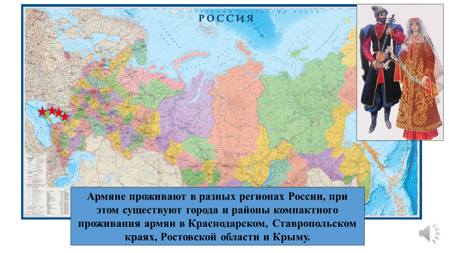 Армяне проживают в разных регионах России, при этом существуют города и районы компактного проживания армян в Краснодарском, Ставропольском краях, Ростовской области и Крыму.