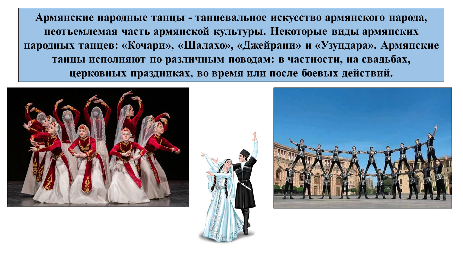Армянские народные танцы - танцевальное искусство армянского народа, неотъемлемая часть армянской культуры. Некоторые виды армянских народных танцев: «Кочари», «Шалахо», «Джейрани» и «Узундара». Армянские танцы исполняют по различным поводам: в частности, на свадьбах, церковных праздниках, во время или после боевых действий.