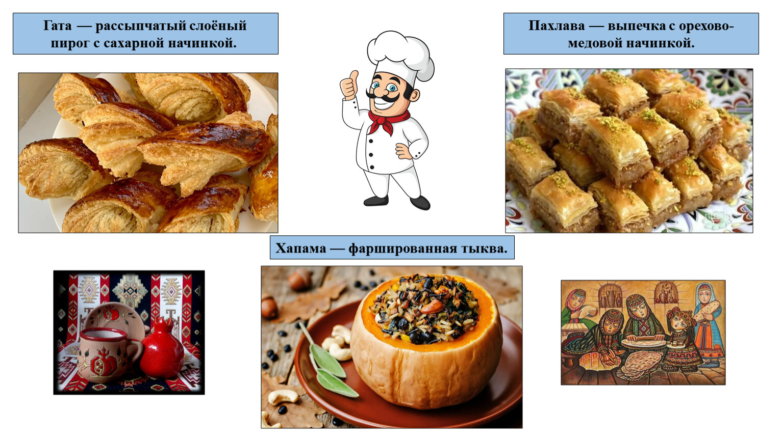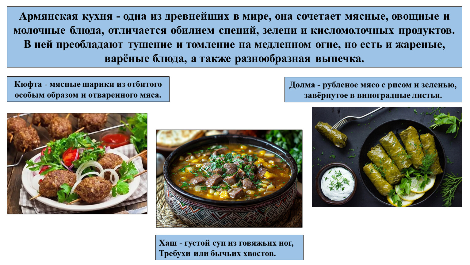 Армянская кухня - одна из древнейших в мире, она сочетает мясные, овощные и молочные блюда, отличается обилием специй, зелени и кисломолочных продуктов. В ней преобладают тушение и томление на медленном огне, но есть и жареные, варёные блюда, а также разнообразная выпечка.