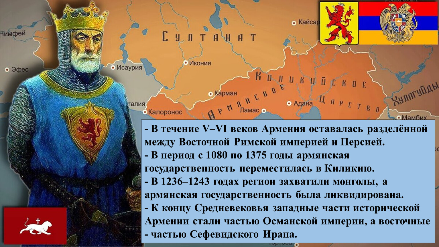 - В период с 1080 по 1375 годы армянская государственность переместилась в Киликию.