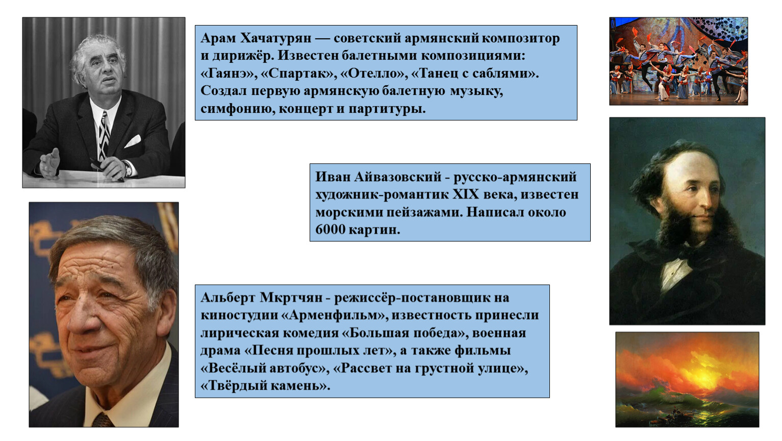 Арам Хачатурян — советский армянский композитор и дирижёр. Известен балетными композициями: «Гаянэ», «Спартак», «Отелло», «Танец с саблями». Создал первую армянскую балетную музыку, симфонию, концерт и партитуры.