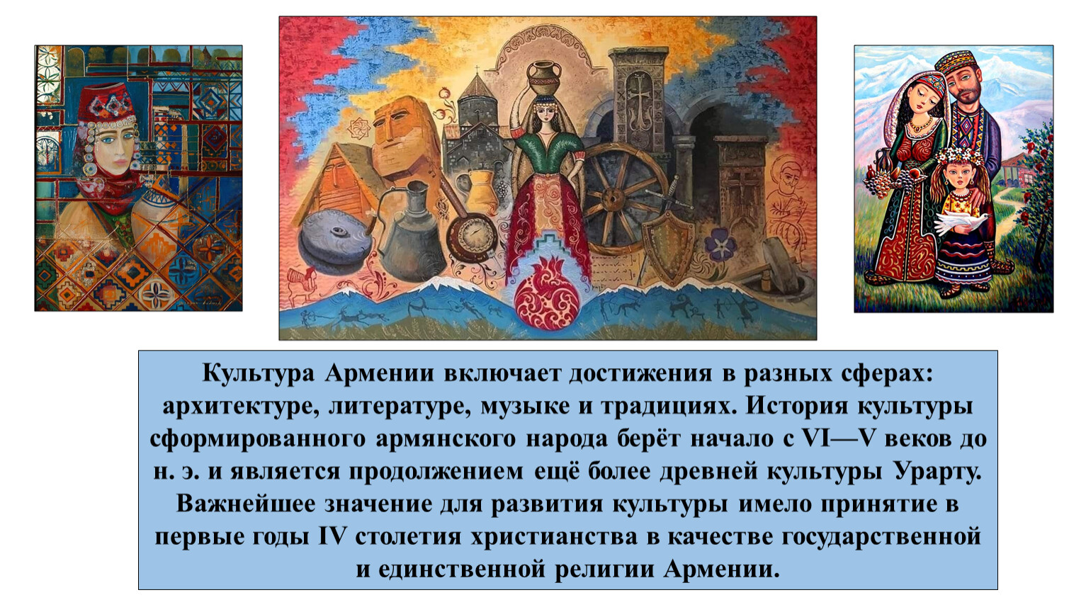Культура Армении включает достижения в разных сферах: архитектуре, литературе, музыке и традициях. История культуры сформированного армянского народа берёт начало с VI—V веков до н. э. и является продолжением ещё более древней культуры Урарту. Важнейшее значение для развития культуры имело принятие в первые годы IV столетия христианства в качестве государственной и единственной религии Армении.