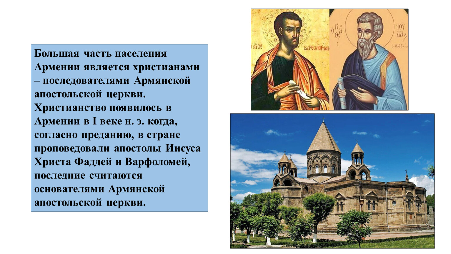Большая часть населения Армении является христианами – последователями Армянской апостольской церкви.