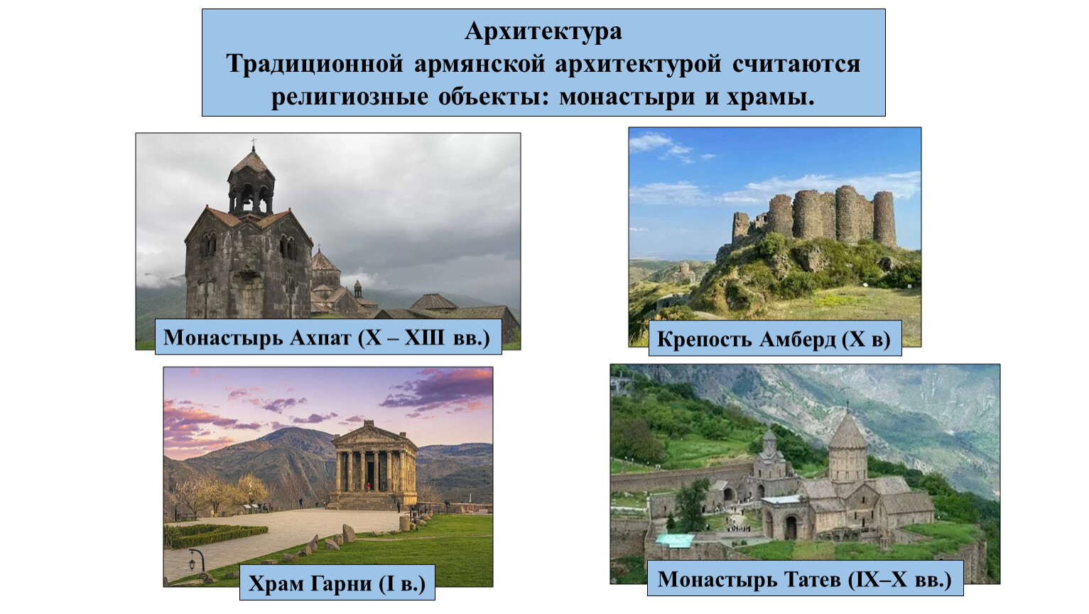 Традиционной армянской архитектурой считаются религиозные объекты: монастыри и храмы.