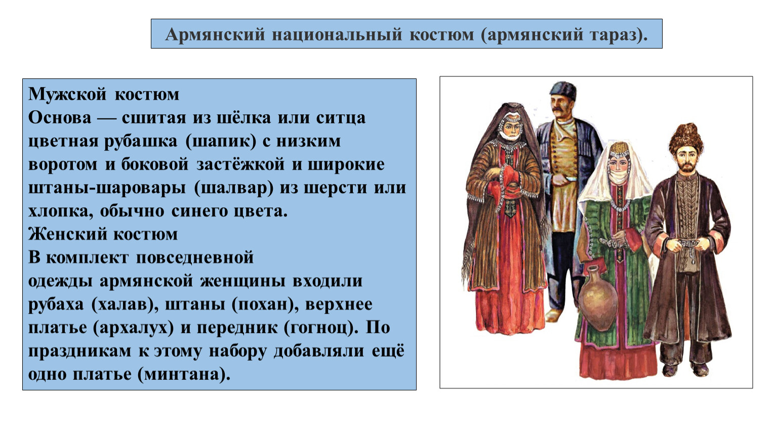 В комплект повседневной одежды армянской женщины входили рубаха (халав), штаны (похан), верхнее платье (архалух) и передник (гогноц). По праздникам к этому набору добавляли ещё одно платье (минтана).