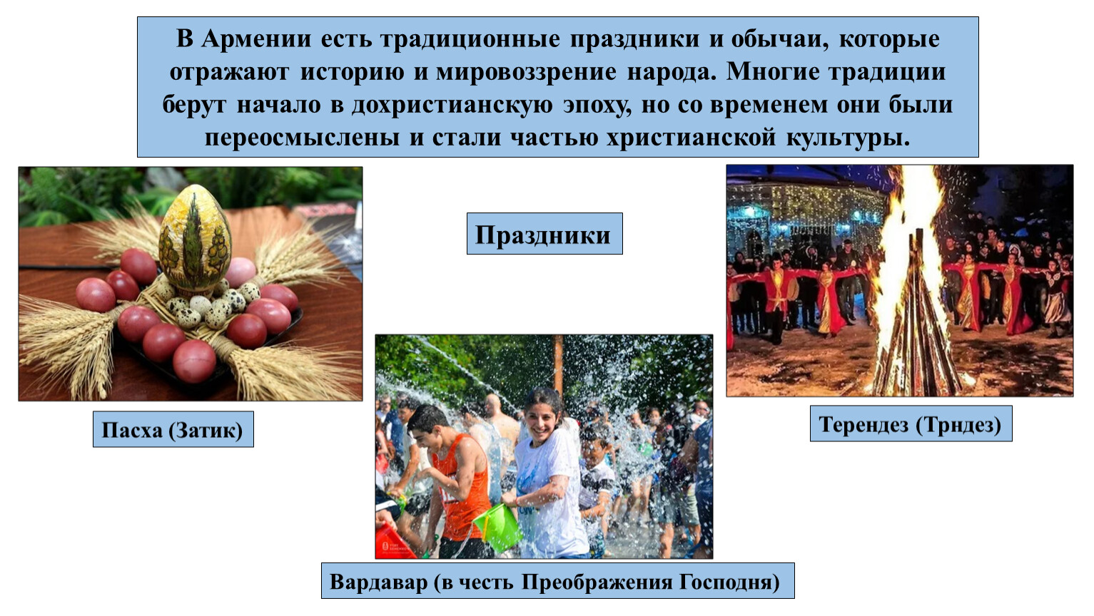 В Армении есть традиционные праздники и обычаи, которые отражают историю и мировоззрение народа. Многие традиции берут начало в дохристианскую эпоху, но со временем они были переосмыслены и стали частью христианской культуры.