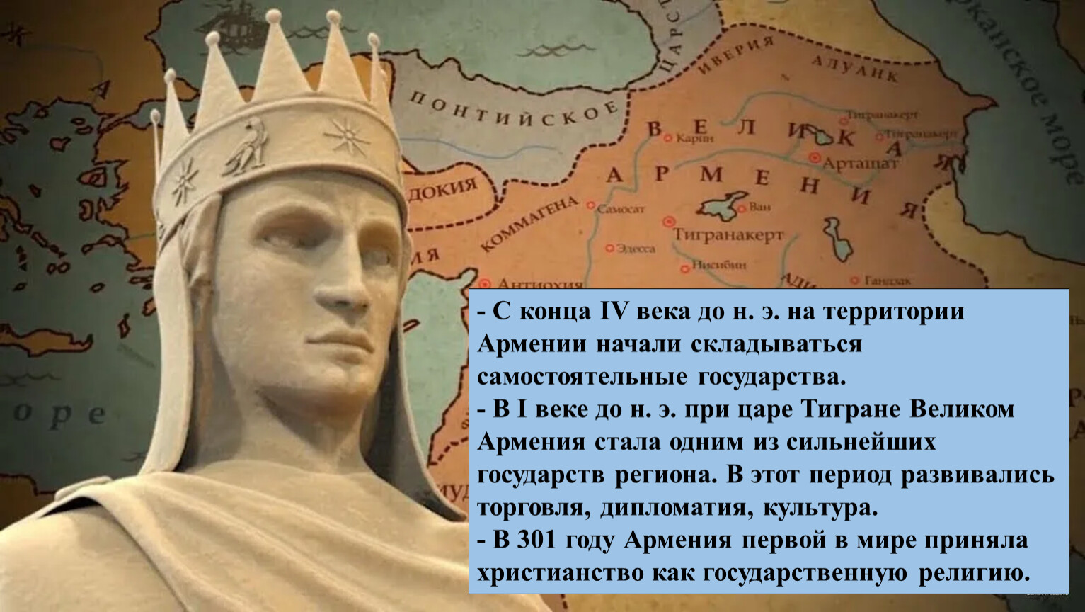 - В I веке до н. э. при царе Тигране Великом Армения стала одним из сильнейших государств региона. В этот период развивались торговля, дипломатия, культура.