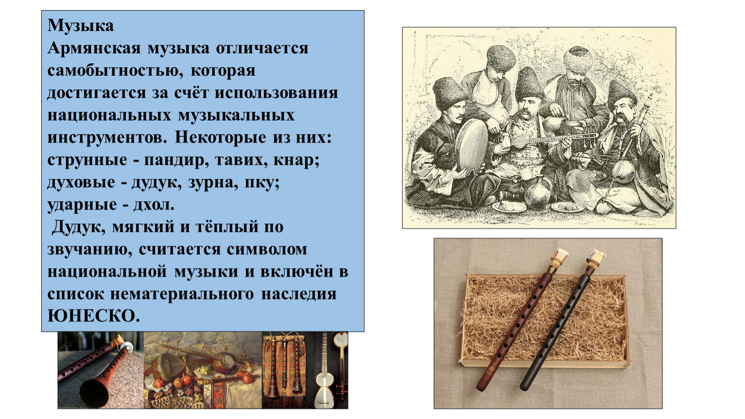 Дудук, мягкий и тёплый по звучанию, считается символом национальной музыки и включён в список нематериального наследия ЮНЕСКО.