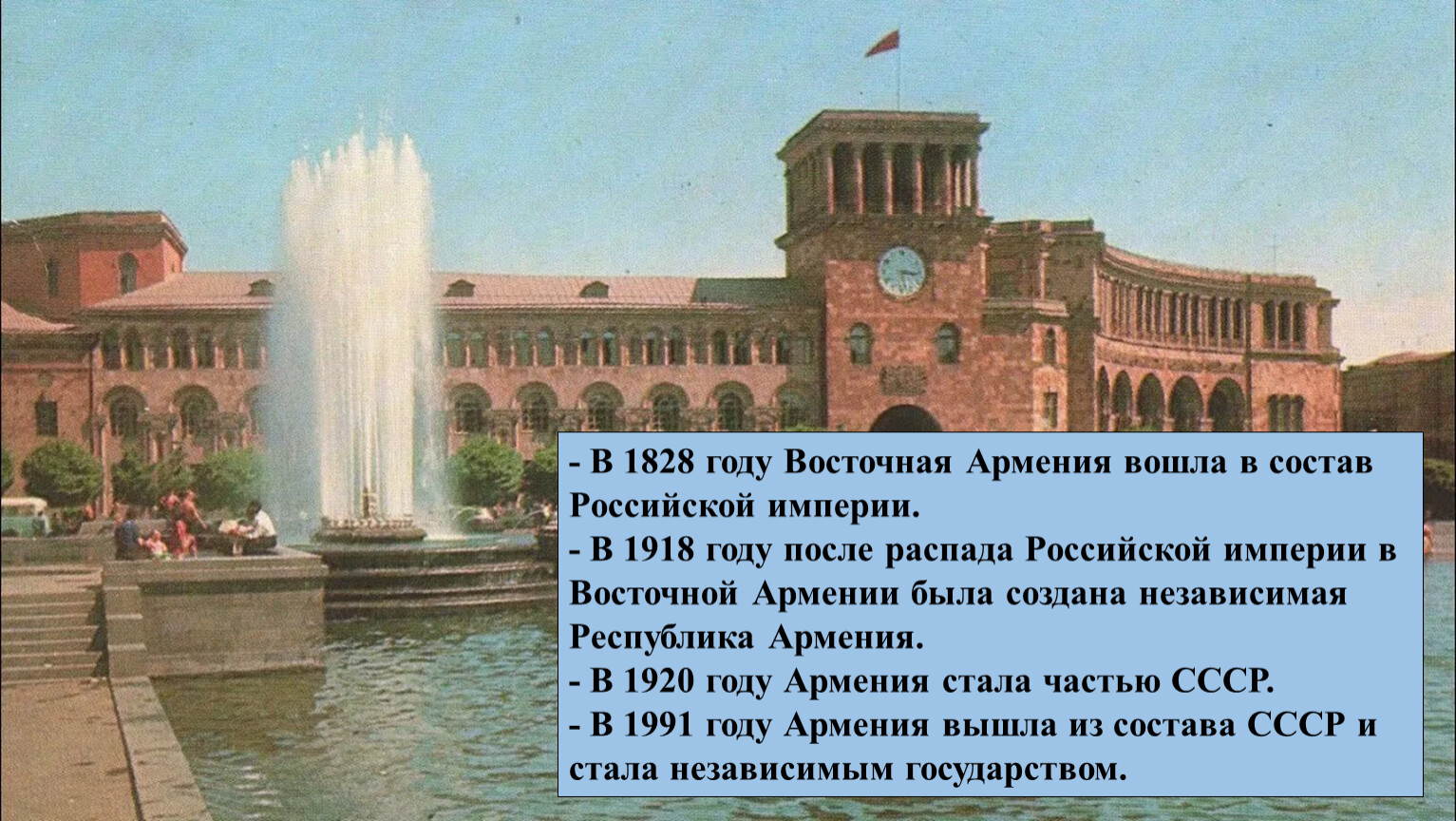 - В 1918 году после распада Российской империи в Восточной Армении была создана независимая Республика Армения.