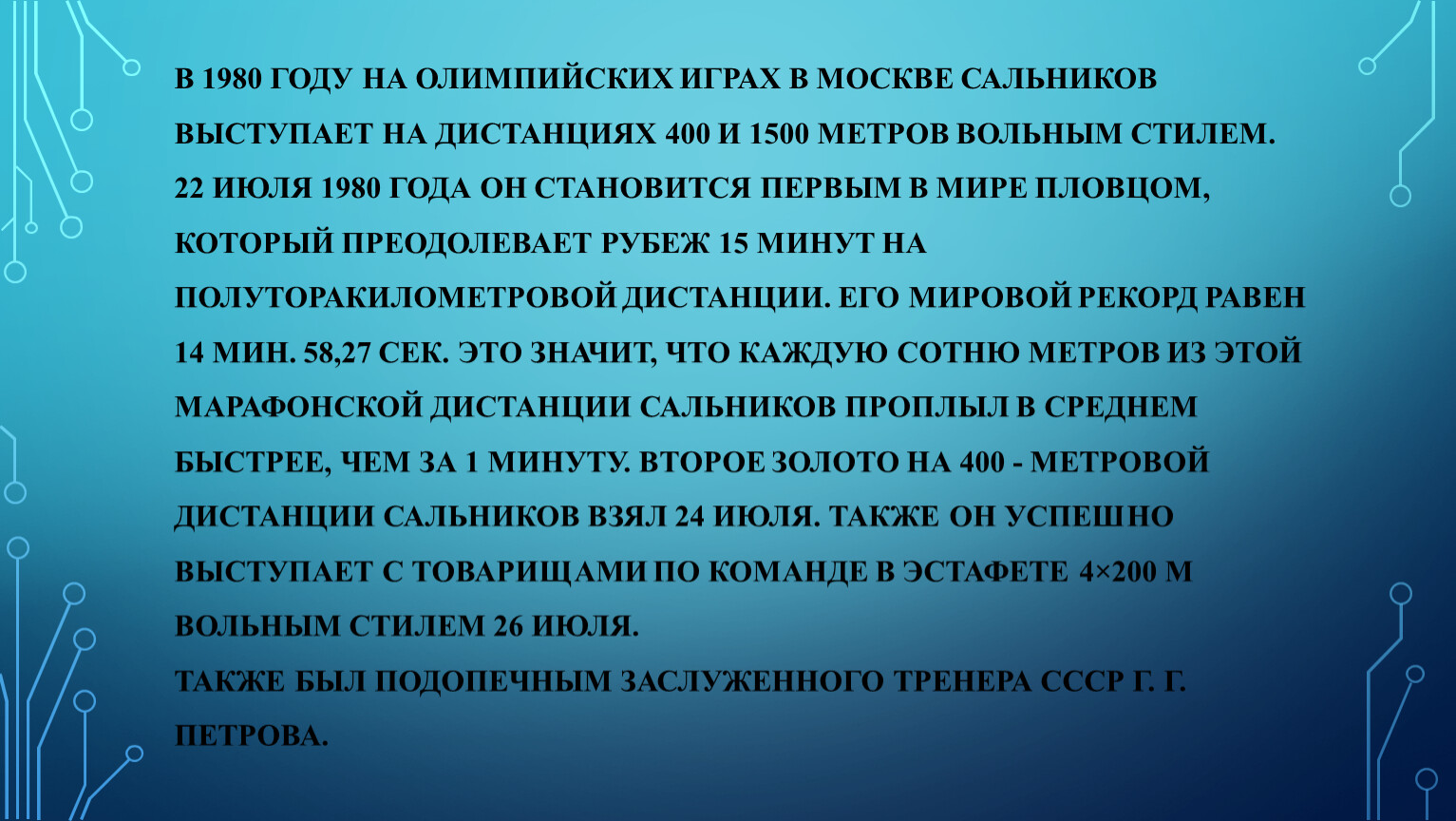 В 1980 году на Олимпийских играх в Москве Сальников выступает на дистанциях 400 и 1500 метров вольным стилем.22 июля 1980 года он становится первым в мире пловцом, который преодолевает рубеж 15 минут на полуторакилометровой дистанции. Его мировой рекорд равен 14 мин. 58,27 сек. Это значит, что каждую сотню метров из этой марафонской дистанции Сальников проплыл в среднем быстрее, чем за 1 минуту. Второе золото на 400 - метровой дистанции Сальников взял 24 июля. Также он успешно выступает с товарищами по команде в эстафете 4×200 м вольным стилем 26 июля.Также был подопечным Заслуженного тренера СССР Г. Г. Петрова.