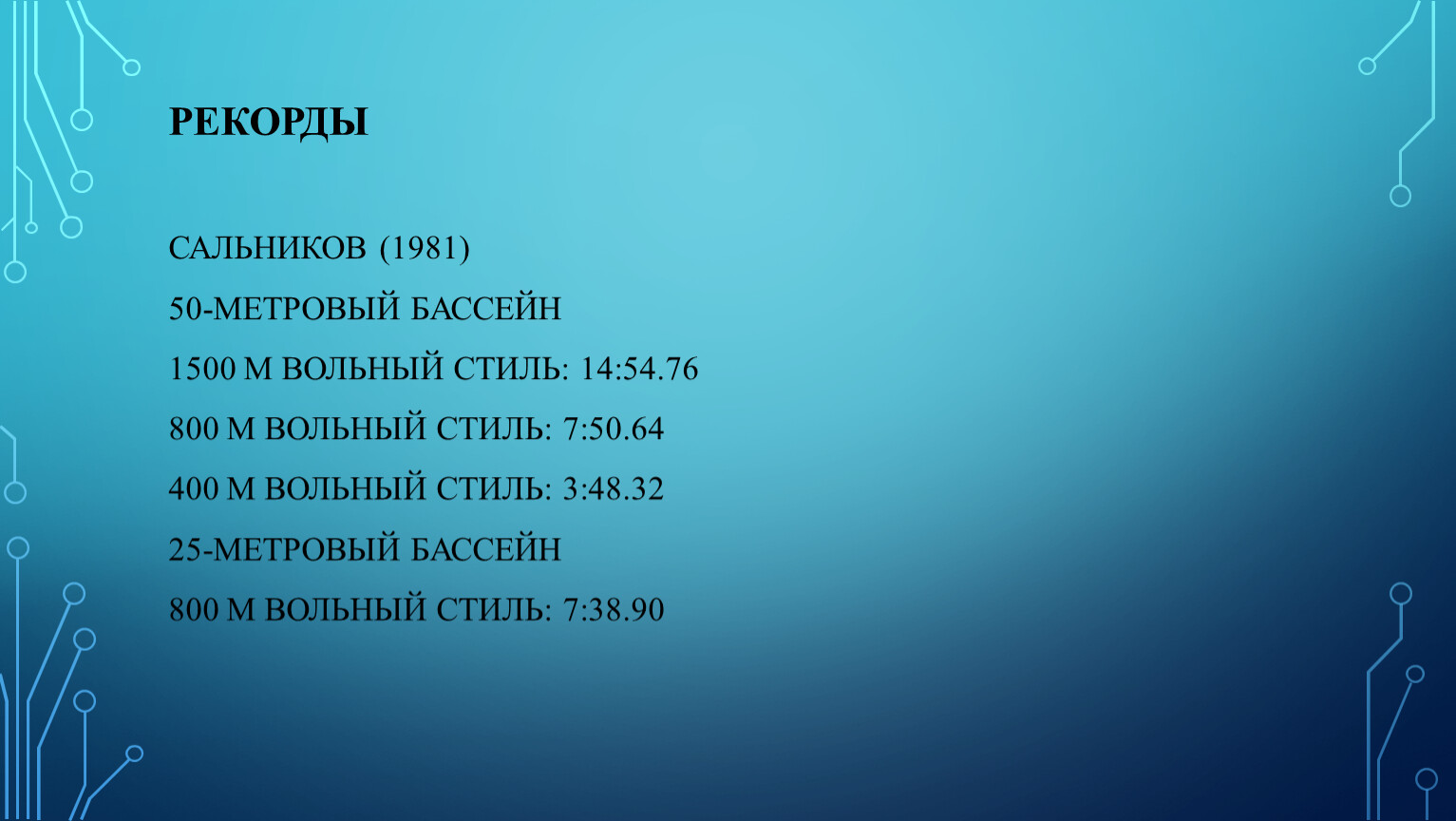 РекордыСальников (1981)50-метровый бассейн1500 м вольный стиль: 14:54.76800 м вольный стиль: 7:50.64400 м вольный стиль: 3:48.3225-метровый бассейн800 м вольный стиль: 7:38.90