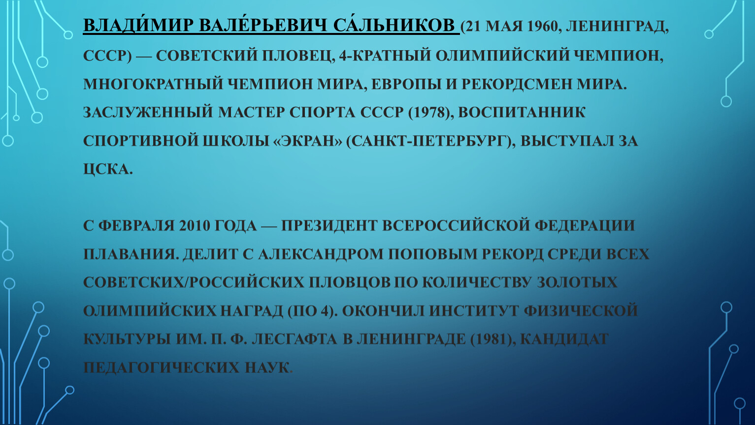 Влади́мир Вале́рьевич Са́льников (21 мая 1960, Ленинград, СССР) — советский пловец, 4-кратный олимпийский чемпион, многократный чемпион мира, Европы и рекордсмен мира. Заслуженный мастер спорта СССР (1978), воспитанник спортивной школы «Экран» (Санкт-Петербург), выступал за ЦСКА.С февраля 2010 года — президент Всероссийской федерации плавания. Делит с Александром Поповым рекорд среди всех советских/российских пловцов по количеству золотых олимпийских наград (по 4). Окончил институт физической культуры им. П. Ф. Лесгафта в Ленинграде (1981), кандидат педагогических наук.