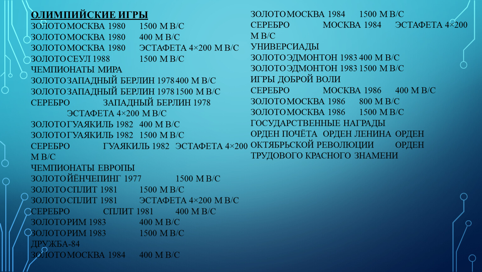 Олимпийские игрыЗолото Москва 1980 1500 м в/сЗолото Москва 1980 400 м в/сЗолото Москва 1980 эстафета 4×200 м в/сЗолото Сеул 1988 1500 м в/сЧемпионаты мираЗолото Западный Берлин 1978 400 м в/сЗолото Западный Берлин 1978 1500 м в/сСеребро Западный Берлин 1978 эстафета 4×200 м в/сЗолото Гуаякиль 1982 400 м в/сЗолото Гуаякиль 1982 1500 м в/сСеребро Гуаякиль 1982 эстафета 4×200 м в/сЧемпионаты ЕвропыЗолото Йёнчепинг 1977 1500 м в/сЗолото Сплит 1981 1500 м в/сЗолото Сплит 1981 эстафета 4×200 м в/сСеребро Сплит 1981 400 м в/сЗолото Рим 1983 400 м в/сЗолото Рим 1983 1500 м в/сДружба-84Золото Москва 1984 400 м в/сЗолото Москва 1984 1500 м в/сСеребро Москва 1984 эстафета 4×200 м в/сУниверсиадыЗолото Эдмонтон 1983 400 м в/сЗолото Эдмонтон 1983 1500 м в/сИгры доброй волиСеребро Москва 1986 400 м в/сЗолото Москва 1986 800 м в/сЗолото Москва 1986 1500 м в/сГосударственные наградыОрден Почёта Орден Ленина Орден Октябрьской Революции Орден Трудового Красного Знамени