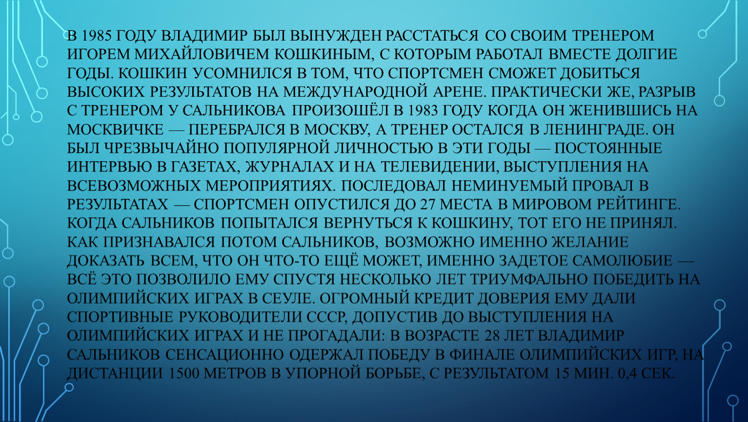 В 1985 году Владимир был вынужден расстаться со своим тренером Игорем Михайловичем Кошкиным, с которым работал вместе долгие годы. Кошкин усомнился в том, что спортсмен сможет добиться высоких результатов на международной арене. Практически же, разрыв с тренером у Сальникова произошёл в 1983 году когда он женившись на москвичке — перебрался в Москву, а тренер остался в Ленинграде. Он был чрезвычайно популярной личностью в эти годы — постоянные интервью в газетах, журналах и на телевидении, выступления на всевозможных мероприятиях. Последовал неминуемый провал в результатах — спортсмен опустился до 27 места в мировом рейтинге. Когда Сальников попытался вернуться к Кошкину, тот его не принял. Как признавался потом Сальников, возможно именно желание доказать всем, что он что-то ещё может, именно задетое самолюбие — всё это позволило ему спустя несколько лет триумфально победить на Олимпийских играх в Сеуле. Огромный кредит доверия ему дали спортивные руководители СССР, допустив до выступления на Олимпийских играх и не прогадали: в возрасте 28 лет Владимир Сальников сенсационно одержал победу в финале Олимпийских игр, на дистанции 1500 метров в упорной борьбе, с результатом 15 мин. 0,4 сек.