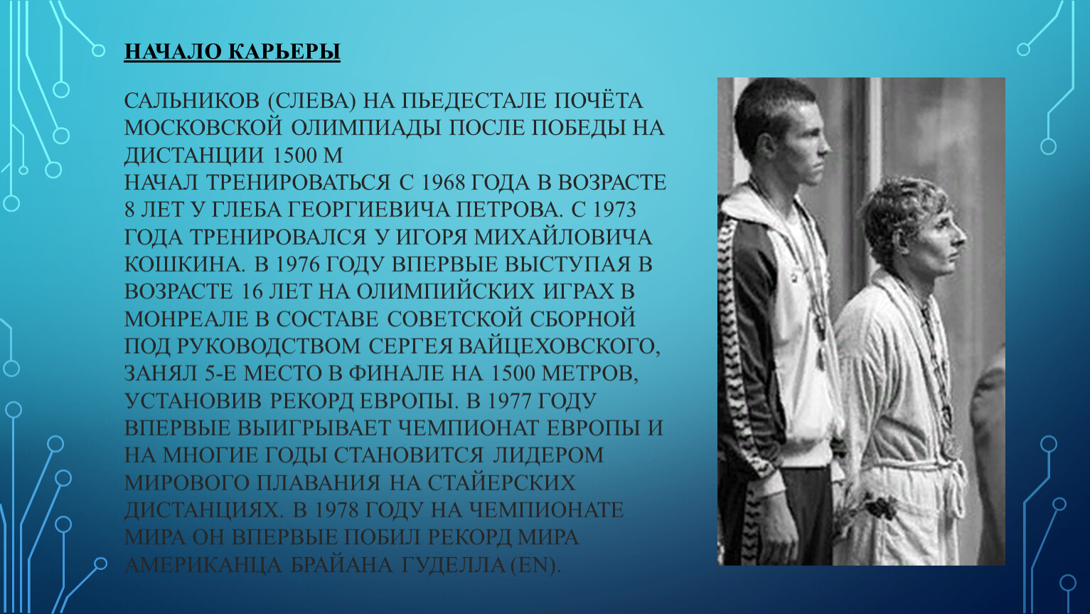 Начало карьерыСальников (слева) на пьедестале почёта московской Олимпиады после победы на дистанции 1500 мНачал тренироваться с 1968 года в возрасте 8 лет у Глеба Георгиевича Петрова. С 1973 года тренировался у Игоря Михайловича Кошкина. В 1976 году впервые выступая в возрасте 16 лет на Олимпийских играх в Монреале в составе советской сборной под руководством Сергея Вайцеховского, занял 5-е место в финале на 1500 метров, установив рекорд Европы. В 1977 году впервые выигрывает чемпионат Европы и на многие годы становится лидером мирового плавания на стайерских дистанциях. В 1978 году на чемпионате мира он впервые побил рекорд мира американца Брайана Гуделла (en).
