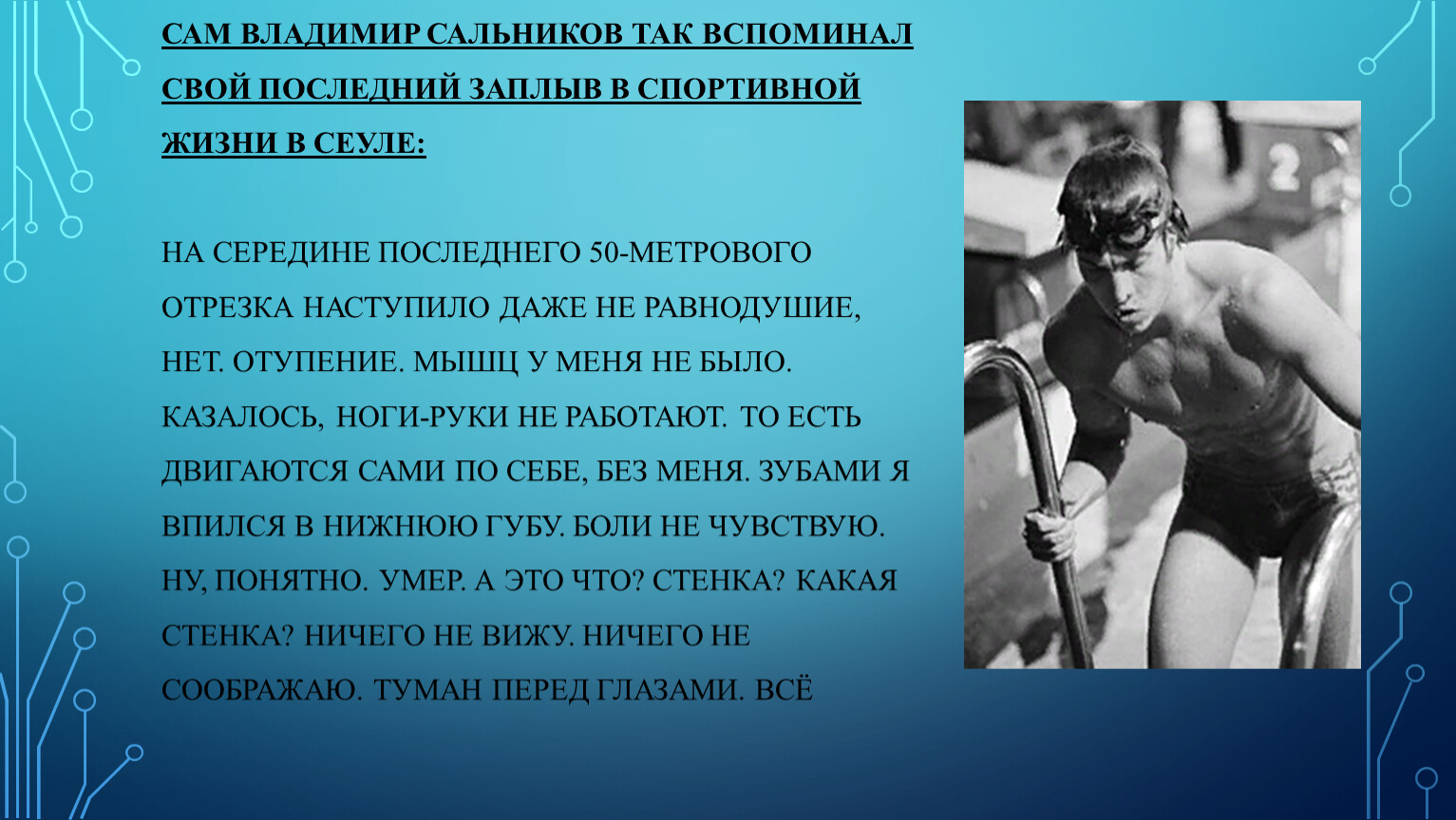 Сам Владимир Сальников так вспоминал свой последний заплыв в спортивной жизни в Сеуле:На середине последнего 50-метрового отрезка наступило даже не равнодушие, нет. Отупение. Мышц у меня не было. Казалось, ноги-руки не работают. То есть двигаются сами по себе, без меня. Зубами я впился в нижнюю губу. Боли не чувствую. Ну, понятно. Умер. А это что? Стенка? Какая стенка? Ничего не вижу. Ничего не соображаю. Туман перед глазами. Всё