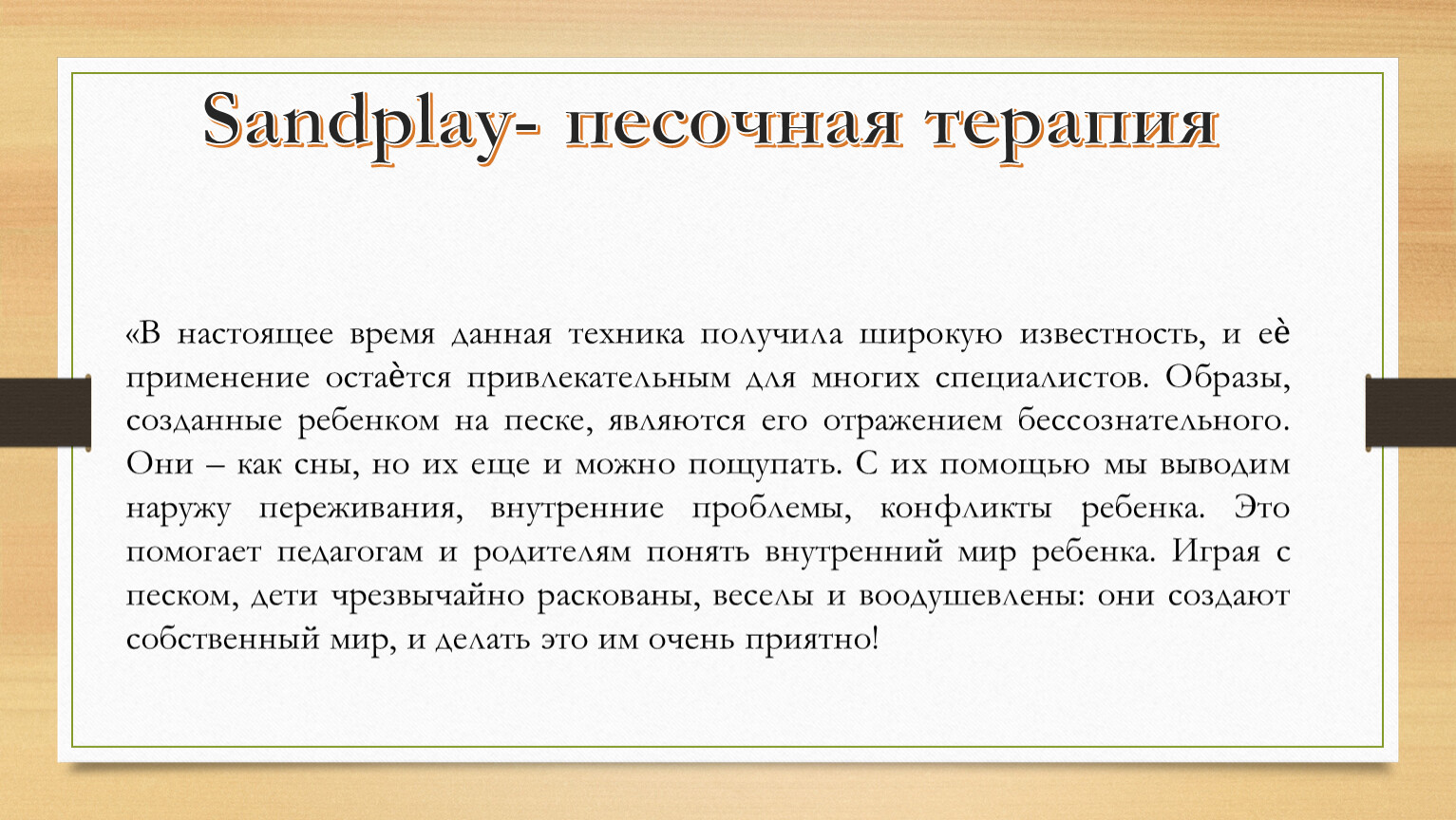 «В настоящее время данная техника получила широкую известность, и еѐ применение остаѐтся привлекательным для многих специалистов. Образы, созданные ребенком на песке, являются его отражением бессознательного. Они – как сны, но их еще и можно пощупать. С их помощью мы выводим наружу переживания, внутренние проблемы, конфликты ребенка. Это помогает педагогам и родителям понять внутренний мир ребенка. Играя с песком, дети чрезвычайно раскованы, веселы и воодушевлены: они создают собственный мир, и делать это им очень приятно!