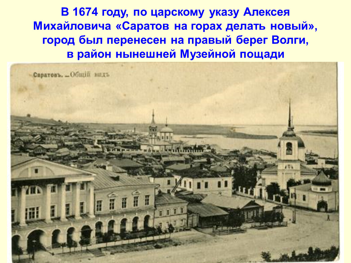 В 1674 году, по царскому указу Алексея Михайловича «Саратов на горах делать новый», город был перенесен на правый берег Волги, в район нынешней Музейной пощади