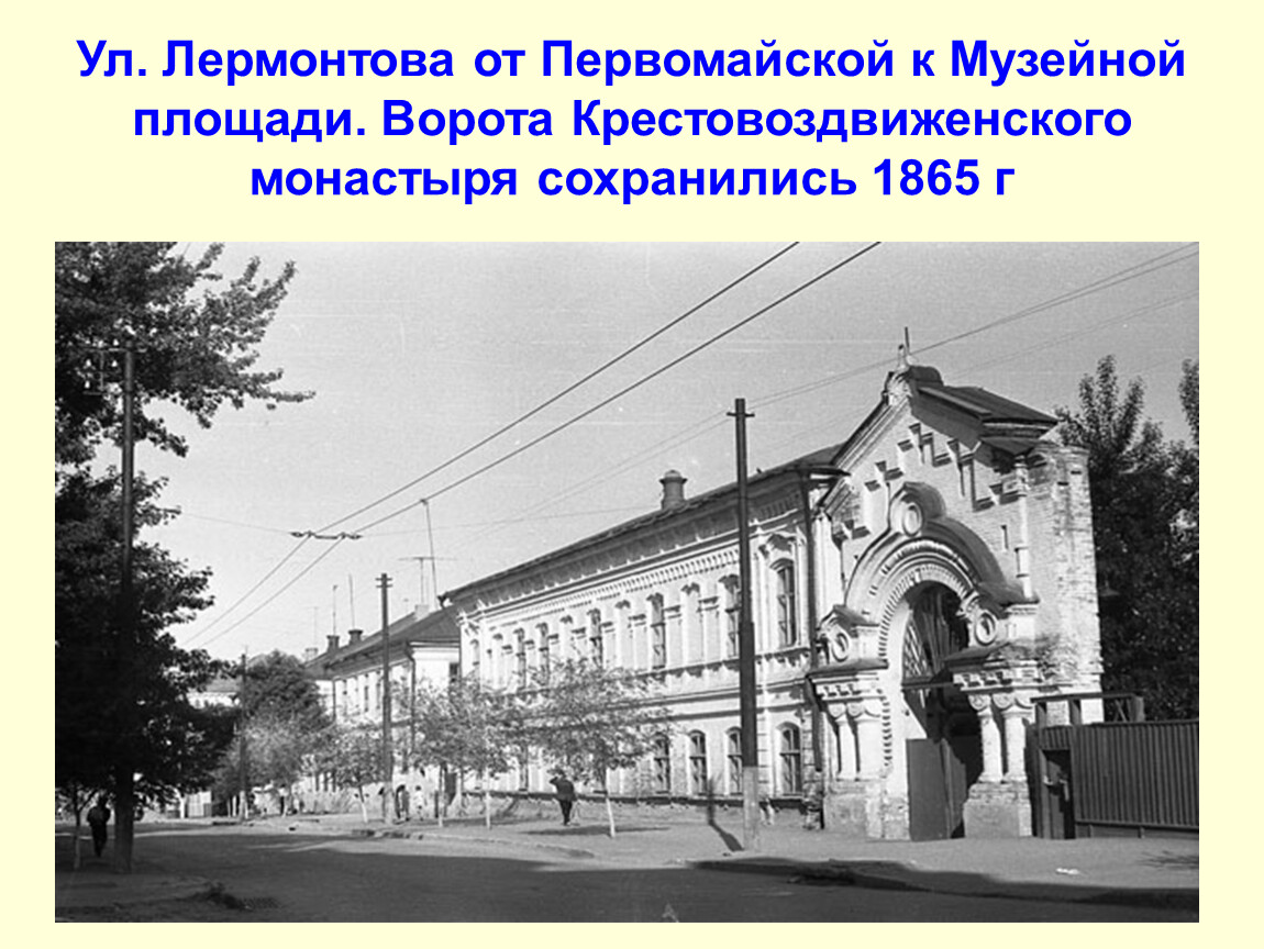 Ул. Лермонтова от Первомайской к Музейной площади. Ворота Крестовоздвиженского монастыря сохранились 1865 г