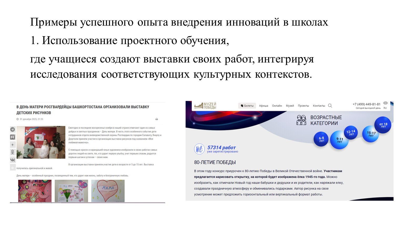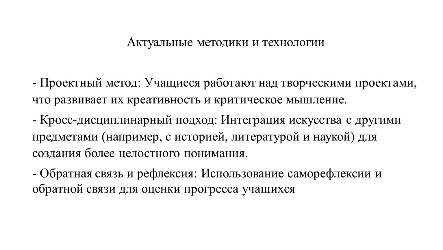 - Кросс-дисциплинарный подход: Интеграция искусства с другими предметами (например, с историей, литературой и наукой) для создания более целостного понимания.