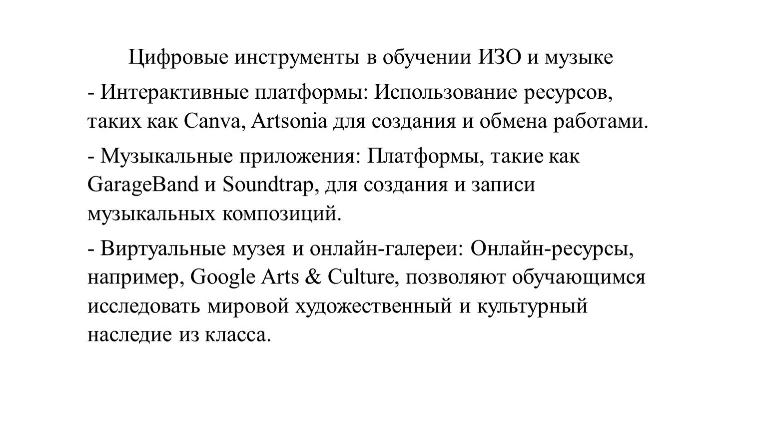 - Виртуальные музея и онлайн-галереи: Онлайн-ресурсы, например, Google Arts & Culture, позволяют обучающимся исследовать мировой художественный и культурный наследие из класса.