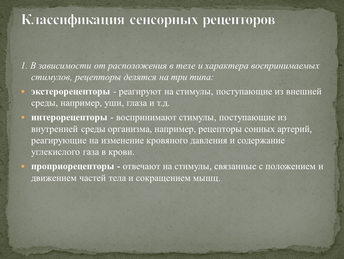 1. В зависимости от расположения в теле и характера воспринимаемых стимулов, рецепторы делятся на три типа: