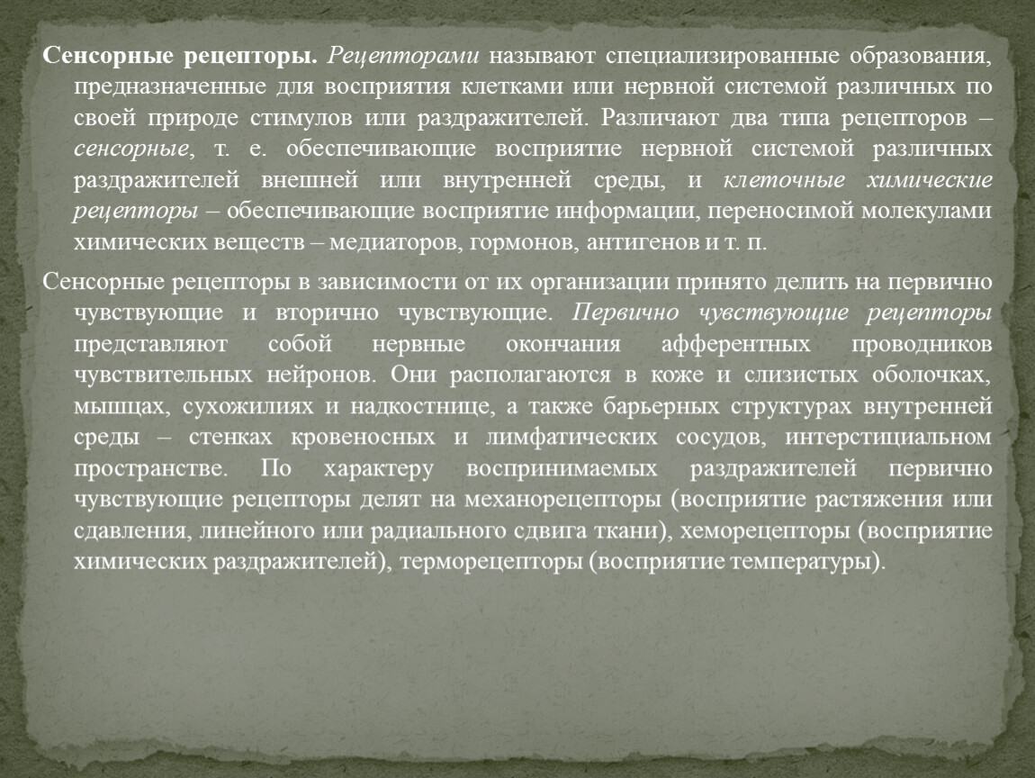 Сенсорные рецепторы в зависимости от их организации принято делить на первично чувствующие и вторично чувствующие. Первично чувствующие рецепторы представляют собой нервные окончания афферентных проводников чувствительных нейронов. Они располагаются в коже и слизистых оболочках, мышцах, сухожилиях и надкостнице, а также барьерных структурах внутренней среды – стенках кровеносных и лимфатических сосудов, интерстициальном пространстве. По характеру воспринимаемых раздражителей первично чувствующие рецепторы делят на механорецепторы (восприятие растяжения или сдавления, линейного или радиального сдвига ткани), хеморецепторы (восприятие химических раздражителей), терморецепторы (восприятие температуры).