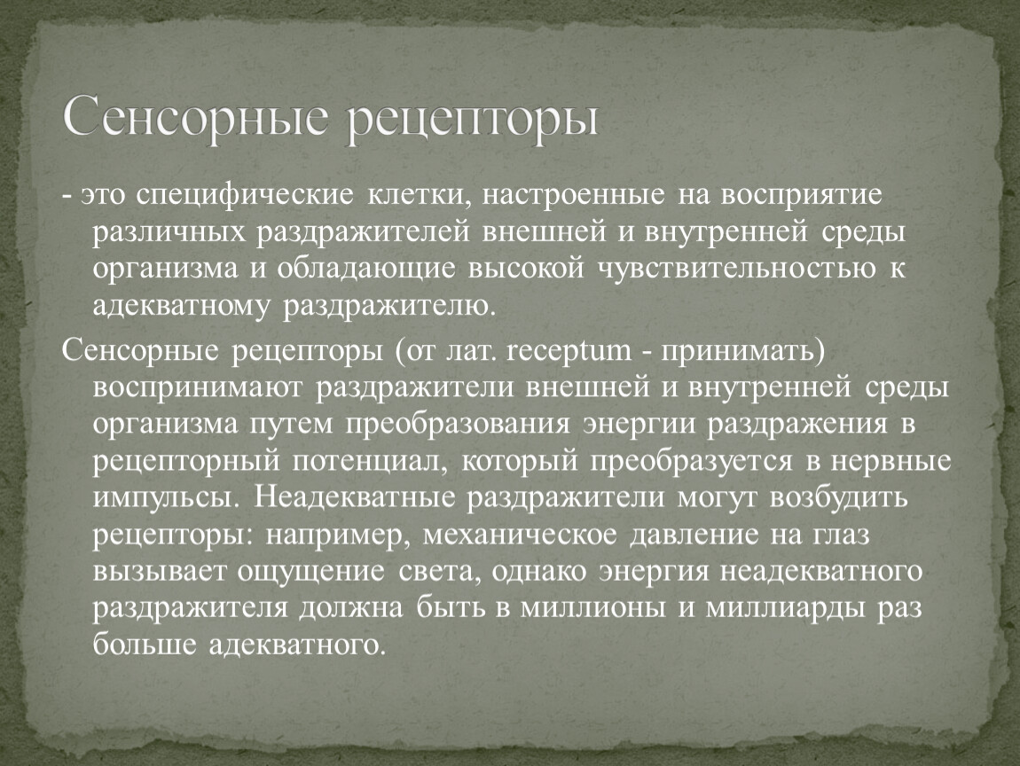 Сенсорные рецепторы (от лат. receptum - принимать) воспринимают раздражители внешней и внутренней среды организма путем преобразования энергии раздражения в рецепторный потенциал, который преобразуется в нервные импульсы. Неадекватные раздражители могут возбудить рецепторы: например, механическое давление на глаз вызывает ощущение света, однако энергия неадекватного раздражителя должна быть в миллионы и миллиарды раз больше адекватного.